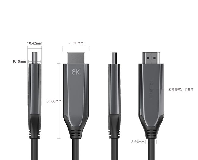 本产品为USB-C转HDMI超高清转接线,长度2米,锌合金外观设计。输入装备可兼容TYPE-C接口的手机,平板电脑,条记本电脑等,输出装备可兼容带有HDMI接口的投影仪,显示器,电视等,支持最新HDMI标准,支持8K、4K@120Hz的区分率输出,将产品的USB-C端与带USB-C接口(DP1.4 Alt Mode 协议,兼容DP1.2 Alt Mode)的主机/电脑等装备相连,将8K视频传输到支持HDMI接口的电视上实现超大屏超高清显示。即插即用,使用利便,简约时尚,易于携带。